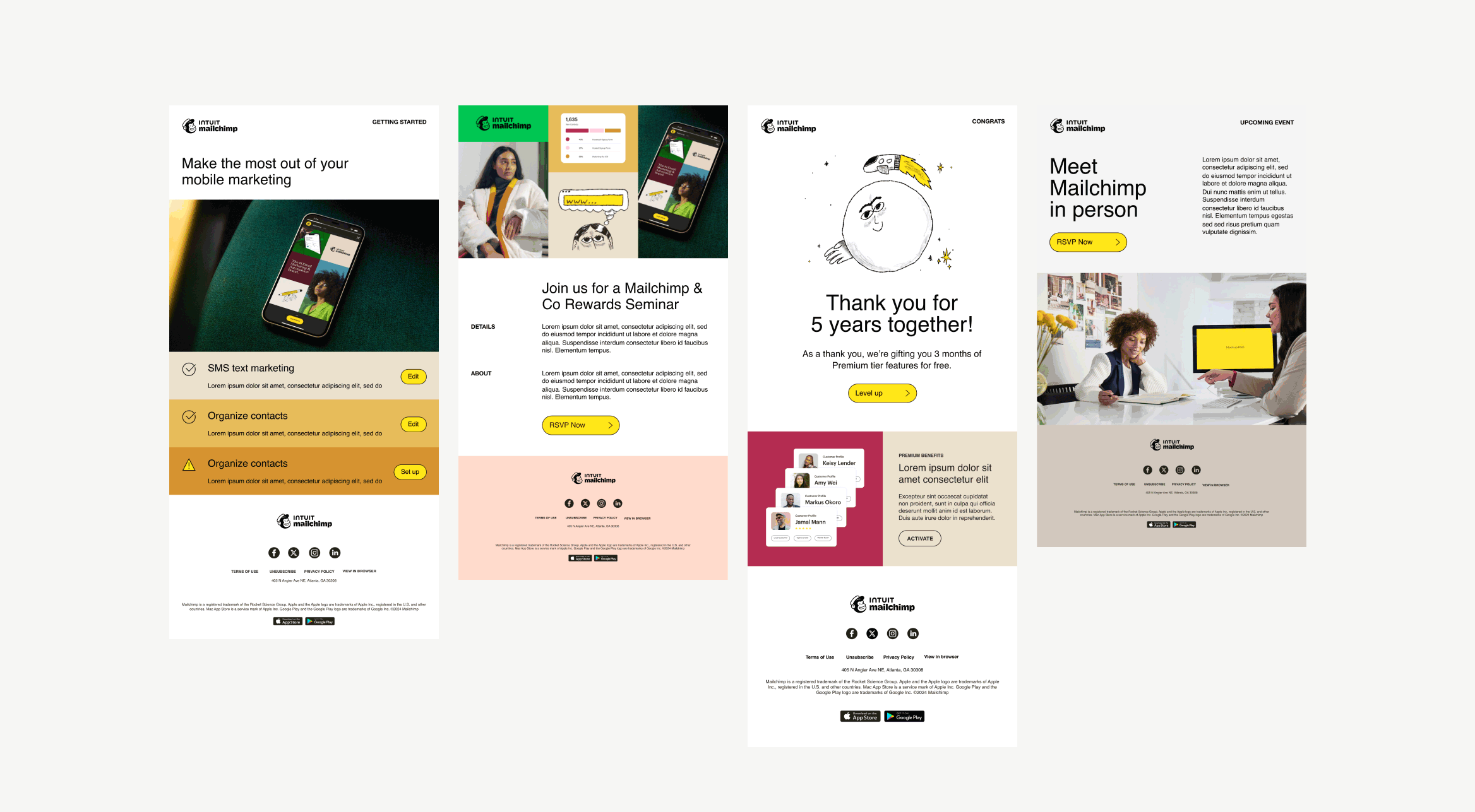 The project began by assessing the limitations of existing templates and processes. From this foundation, I led the global redesign of Mailchimp’s email design system—establishing a modular design system that improved scalability and maintained brand integrity across all campaigns.