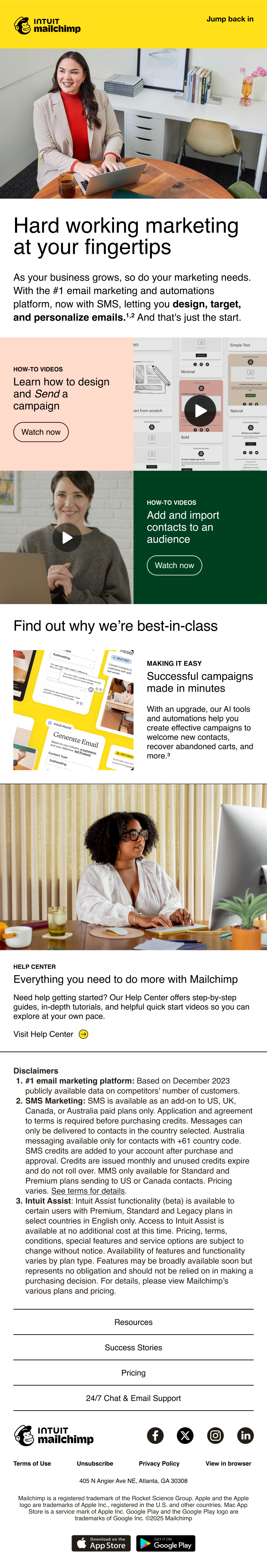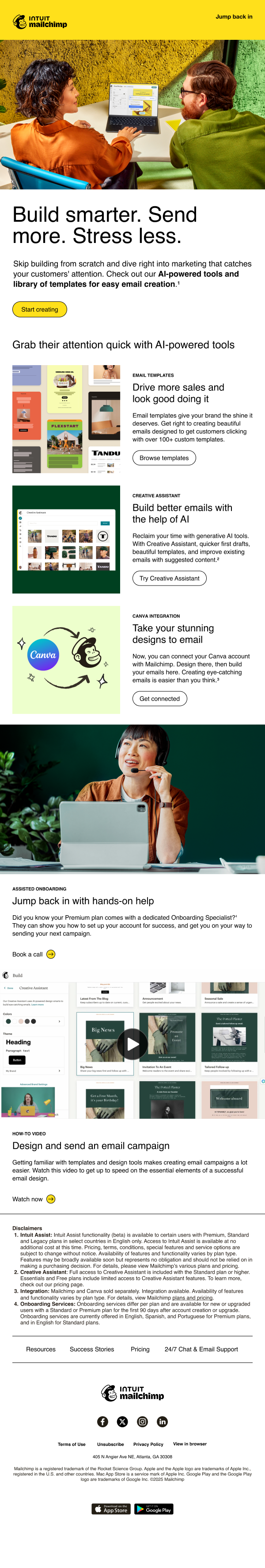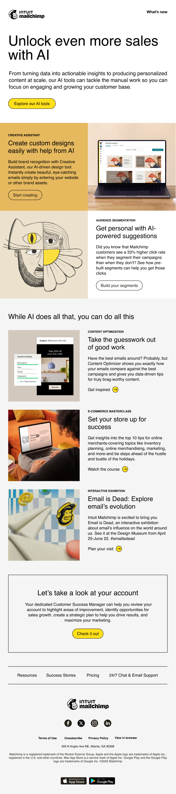 A flexible,composable component library that allows teams to rapidly build customized campaigns while safeguarding design consistency. This system simplifies production, empowers creative and writing teams, and ensures every campaign feels distinctly Mailchimp. It has also expanded beyond Lifecycle Marketing, being adopted by adjacent customer-facing teams outside of Marketing, further demonstrating its value and utility.