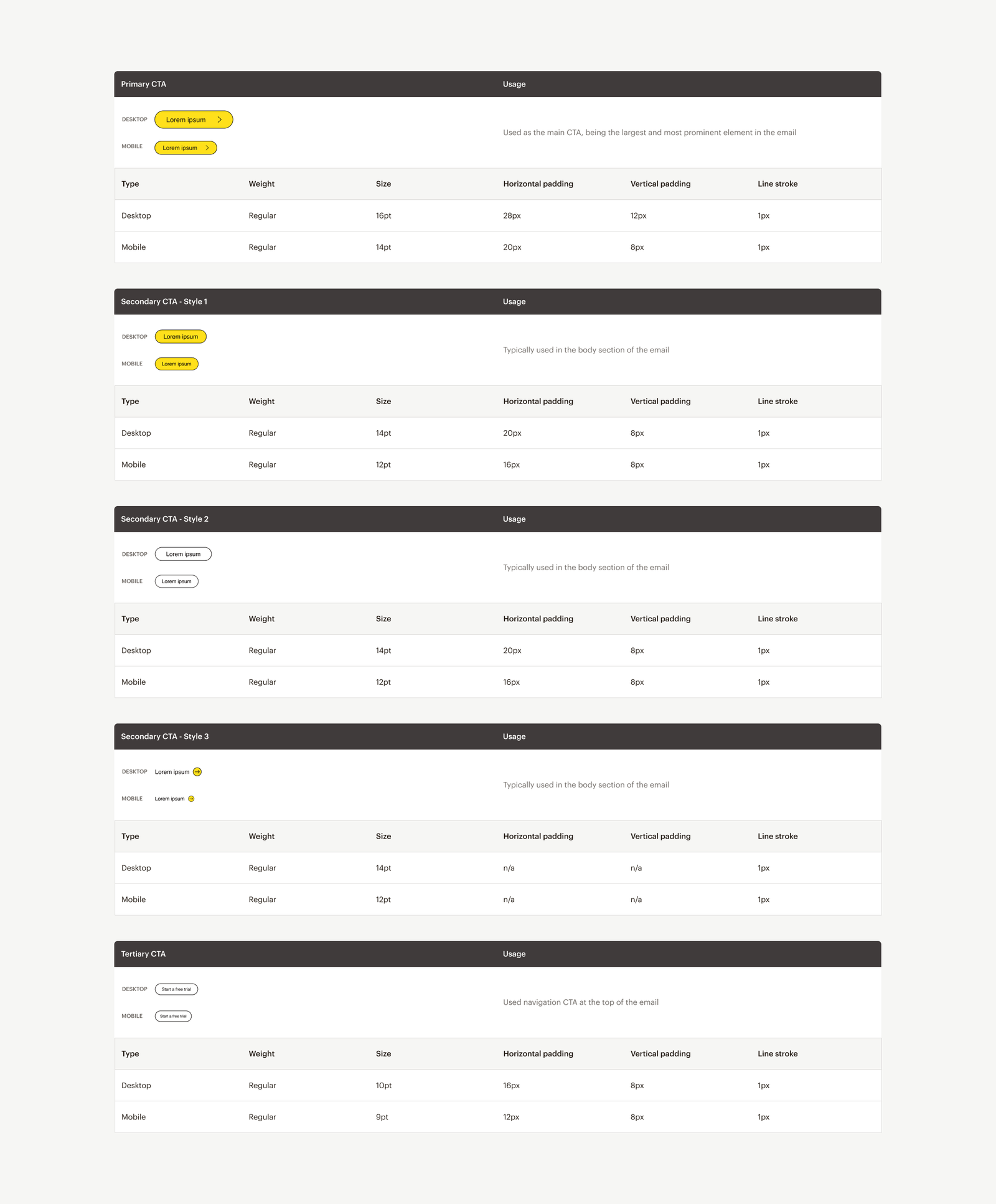 A unified set of typographic styles and button components was defined to maintain consistency, accessibility, and ease of implementation across all emails.
